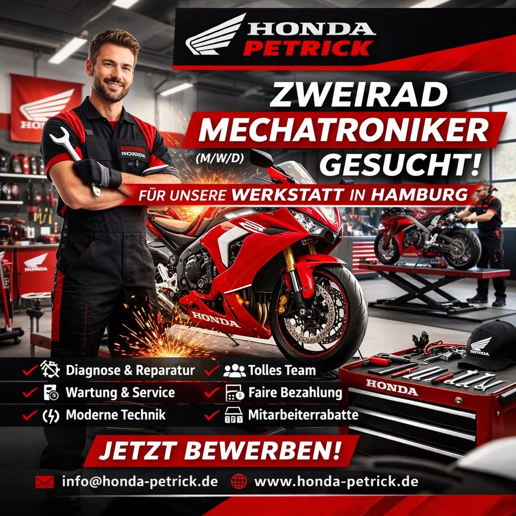 Willkommen bei Honda Petrick! Als einer der führenden Honda-Händler in Hamburg bieten wir nicht nur qualitativ hochwertige Motorräder und Roller, sondern auch einen exzellenten Service rund um Wartung, Reparatur und Beratung. Unser Team ist das Herzstück unseres Erfolgs, und wir suchen einen engagierten Zweiradmechatroniker (m/w/d), der mit uns gemeinsam die Leidenschaft für Motorräder und Technik lebt.